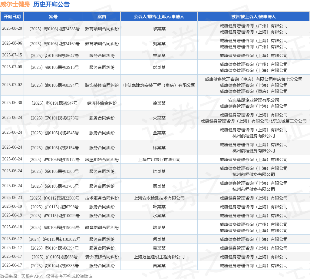 本站消息,根据天眼查APP显示,近日公布了一则威康健身管理咨询(上海)有限公司作为被告/被上诉人的开庭公告,详细内容如下: